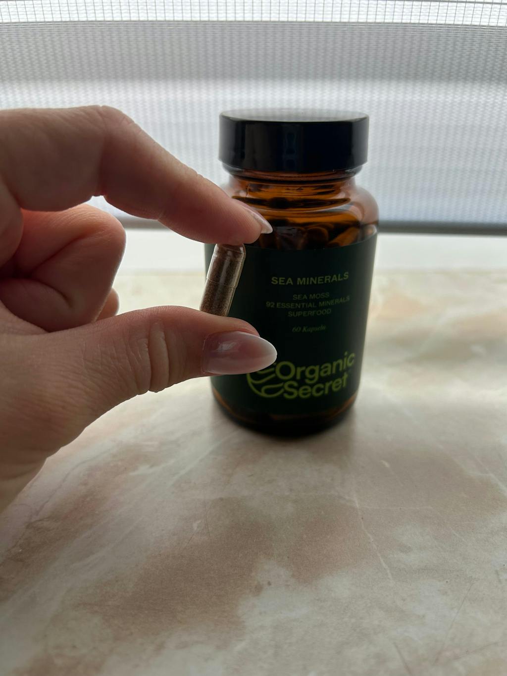 - Ein bis zwei Sea Moss Kapseln aus der Verpackung nehmen und mit Wasser schlucken.